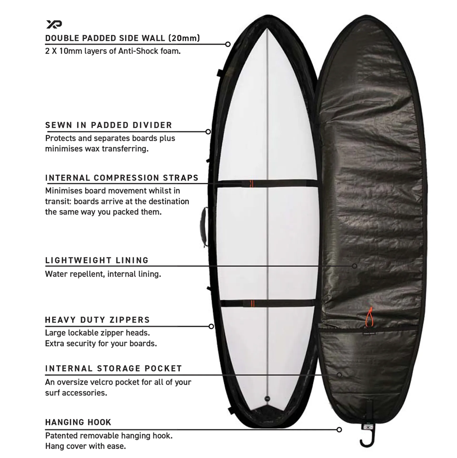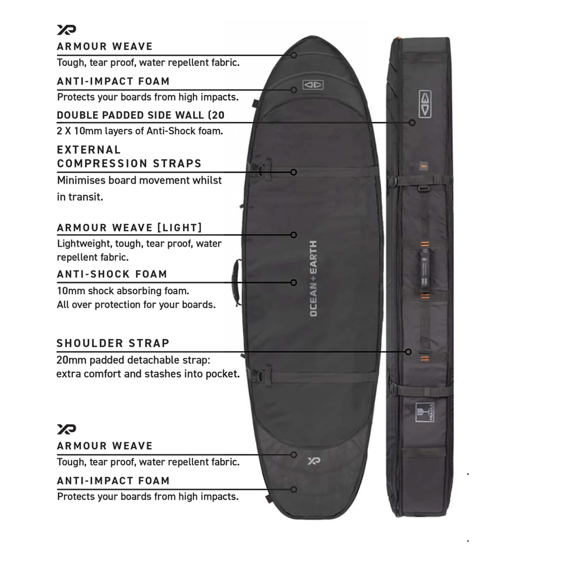 10mm shock absorbing foam gives all over protection for your boards.