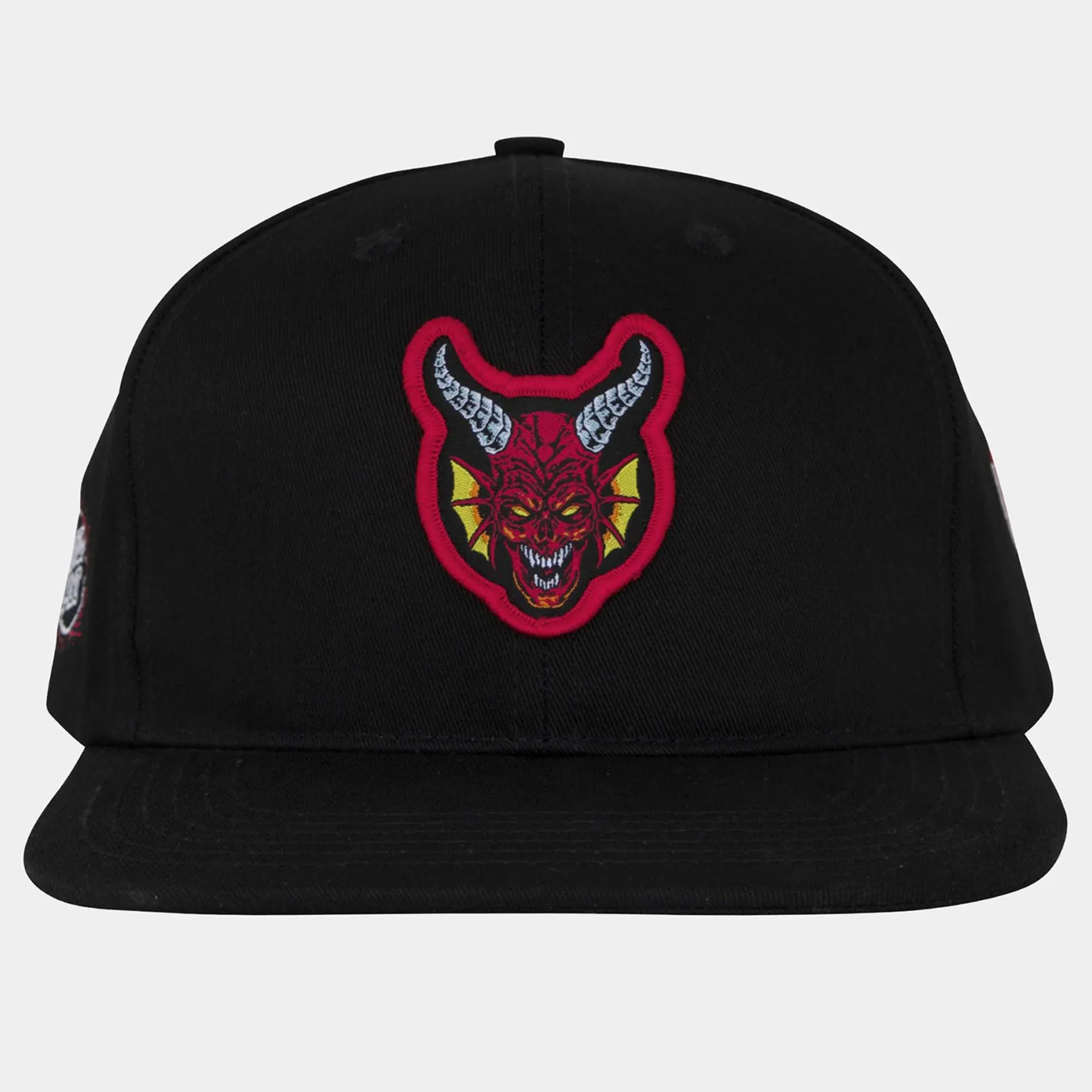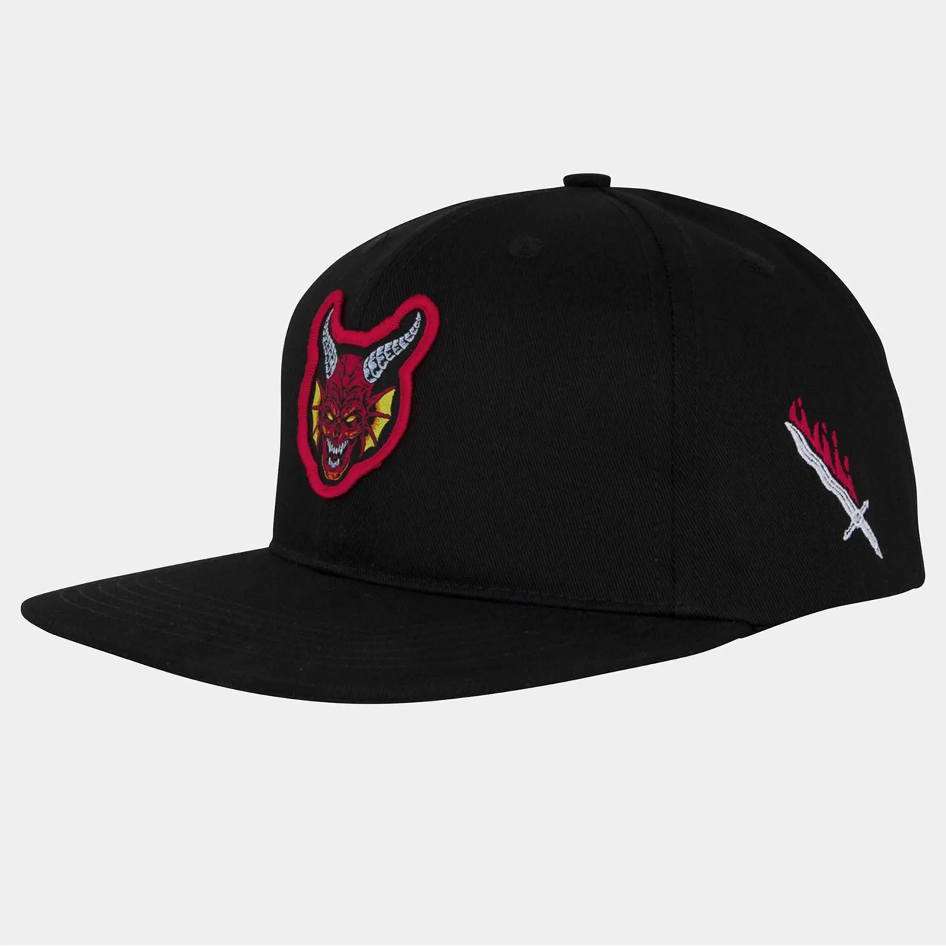 The Santa Cruz Stranger Things Hellfire Club unisex, mid-profile fit structured 6 panel twill snapback hat features front merrowed edge patch, direct embroidery on the side and back panels, sweatband label and custom interior taping.