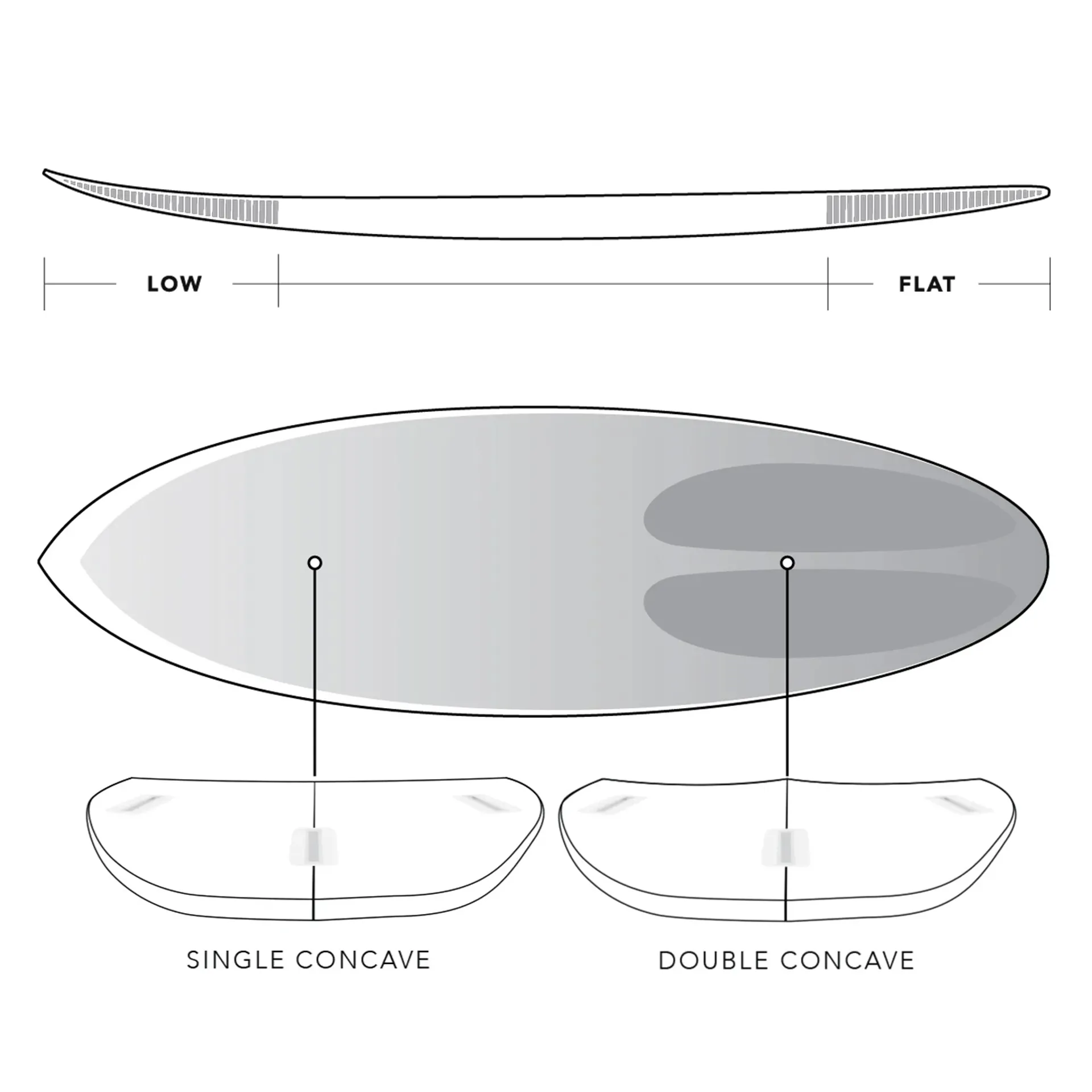 The Bull Run’s bottom contour is all about extra lift and water flow, with easy transition from rail to rail. Single concave starts under the front foot deeper than the Raging Bull for smaller conditions, running through to a moderate double concave forward of the fins.