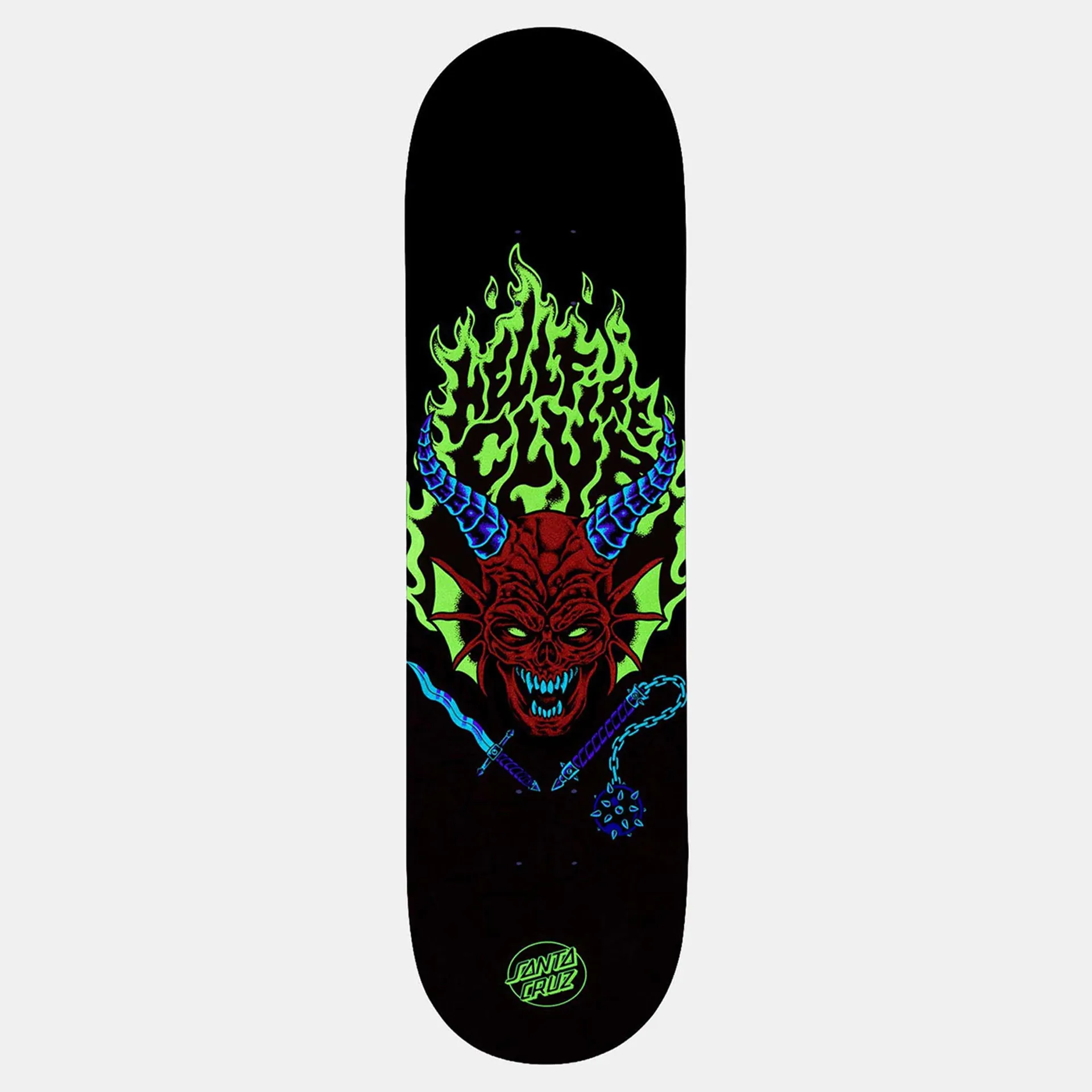 The Santa Cruz Stranger Things Hellfire Club 8.25in x 31.80in deck features multicolor glow in the dark graphics on Santa Cruz's popular 8.25 shape.